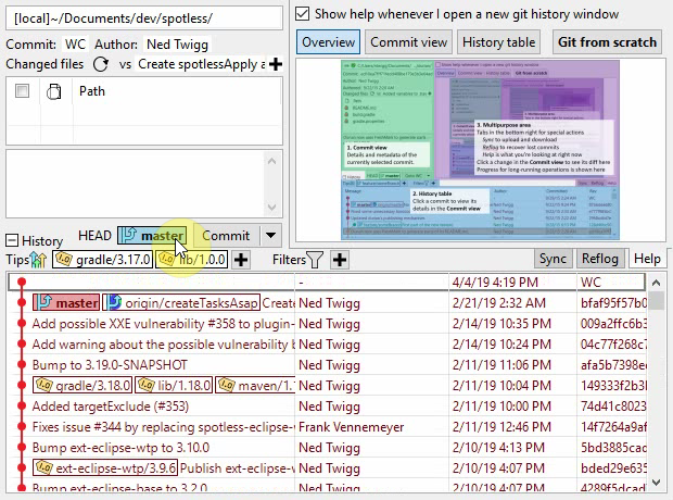 The tips section is useful for searching for branches and navigating history. When you hover the mouse over a branch, it will scroll the history window to show you where that branch is. When you stop hovering, it will scroll back to where you were. When you click a branch, it will scroll the history window there and stop.