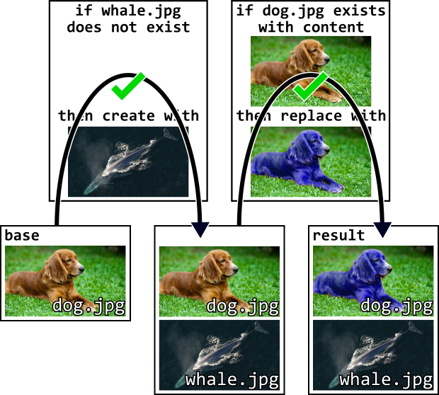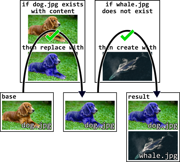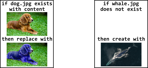 In the example above, it was easy to apply the recipe so long as there wasn't already a file named whale.jpg. If that file already existed, then we had to decide if we should overwrite what was already there. The safest option is to not overwrite anything, and instead alert the user that the recipe conflicts with the existing content. Then the user can look at the existing content and the recipe side-by-side, then decide for herself.