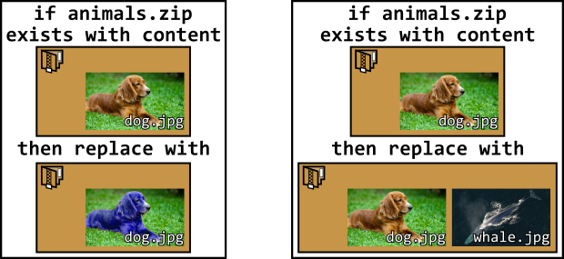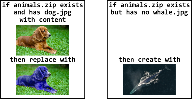 There's no way to apply both patches, because once we have applied one, we have violated the preconditions for the other. If we can put a man on the moon, we should be able to fix this. Instead of treating animals.zip as an indivisible entity, we ought to be able to refer to its contents just like we refer to the contents of our project, right?